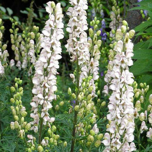 Саженцы Аконита (Борца) клобучкового Альбум (Album) привлекательны внушительными размерами, неприхотливостью и универсальностью. Травянистый многолетник одинаково хорошо растет на солнце и в тенистом цветнике. На прямостоячих прочных стеблях, высотой до метра, распускаются многочисленные белоснежные цветочки удивительной формы: верхние широкие лепестки соединены в подобие капюшона, нижние остаются раскрытыми. Размер каждого бутона не превышает 3 сантиметров. Цветение обильное, с июля по конец сентября.