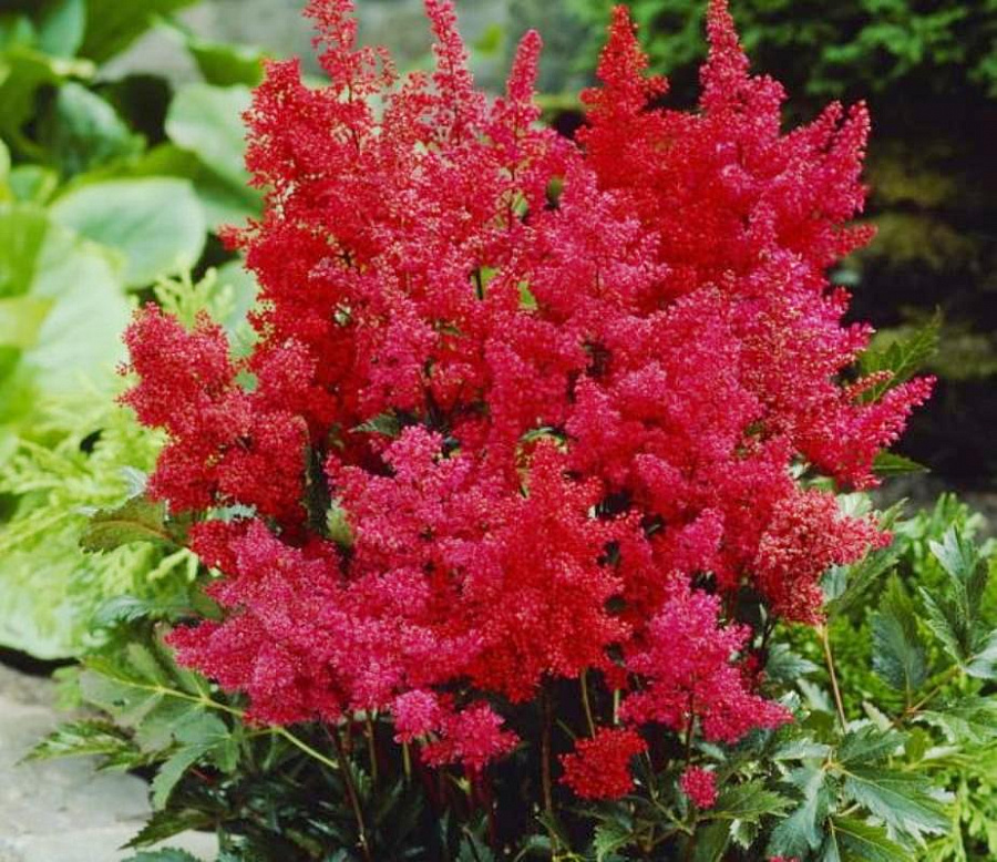 Рассада астильбы Арендса Этна (Etna) вырастают в оригинальные растения с посеченными темно-зелеными листьями и ажурными красными соцветиями ромбовидной формы. Отдельные цветки очень мелкие, и неразличимы на расстоянии. Побеги с соцветиями напоминают ажурные метелки длиной до 25 см. Цветение начинается во второй половине лета и длится до 40 дней.