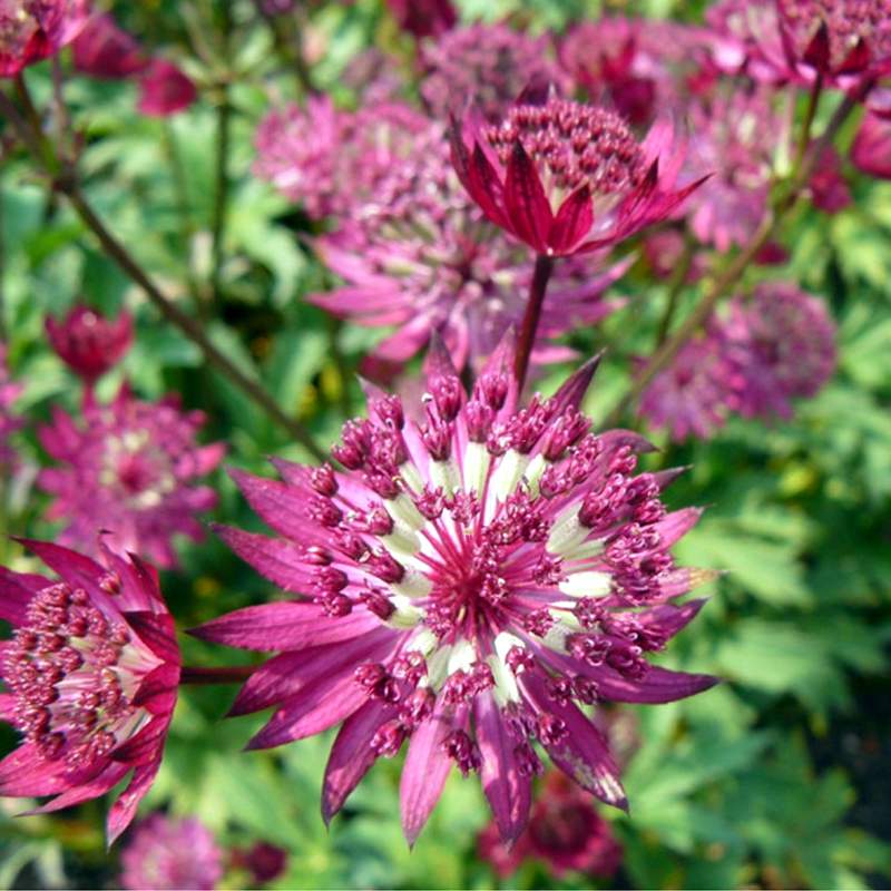 Саженцы Астранции Большой Примадонна (Primadonna) вырастут в красивое и компактное растение с прикорневой розеткой ярко-зеленой листвы, высотой до 60 сантиметров. В начале июля на стеблях раскрываются красивые бордово – сиреневые соцветия, похожие на многолучевую звезду с пышной приподнятой серединкой. Цветущая астранция долго сохраняет декоративность, ее используют для букета, в том числе и сухого.