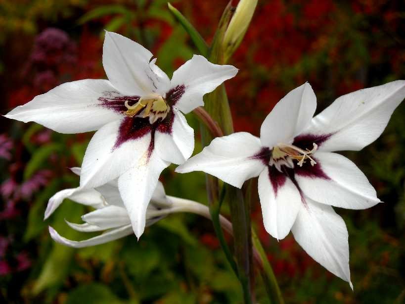 Луковицы ацидантеры Мюриэла (Acidanthera murielae) вырастают очень красивыми цветами, привлекающими изысканным видом и характерным, нежным ароматом. На любой клумбе, в саду или палисаднике становятся настоящей жемчужиной, заметной издали. Многолетник вырастет примерно до 90 сантиметров высотой. Листья внешне похожи на гладиолусные, но более утонченные и нежные. Растение долго стоит в срезке, до недели сохраняя свежий вид. Цветет однократно, но обильно, крупными (около 12 сантиметров диаметром) бутонами белого цвета с темной сердцевиной. Любит влажные, рыхлые почвы.