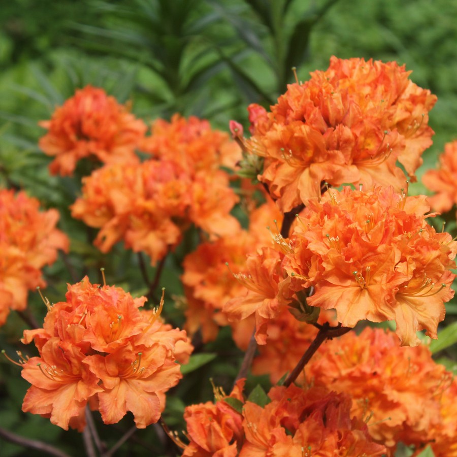 Саженцы Азалии гибридной Спениш Денсер (Azalea Knap Hill spenish-denser) — один из наиболее ярких и эффектных сортов. Его цветы однотонные, насыщенного оранжевого оттенка. На краях лепестков присутствует легкая бахрома, что делает их особенно объемными. Цветение длится с мая по июнь и начинается еще до распускания листьев. Азалия Спениш Денсер — это не слишком высокий (до 130 см), но очень широкий (до 150 см) кустарник. В саду он предпочитает открытые или немного затененные участки, при этом листья и цветы будут одинаково насыщенными. Особого ухода сорт не требует: достаточно регулярно поливать растение, а при резких заморозках (при температуре ниже -25 градусов) сделать укрытие.