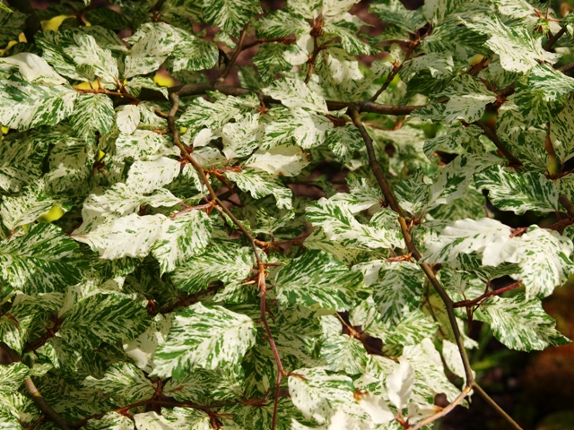 Саженцы Бука лесного Франкен (Fagus sylvatica) – декоративное пестролистное дерево высотой до 4 м. Культура сорта Fagus sylvatica привлекательна для садоводов и ландшафтных дизайнеров необычной окраской листвы. Эллиптические листья неоднородно окрашены в зеленый и белый цвет. Отдельные листья лишены зеленого пигмента. Диаметр кроны достигает 2 м.
