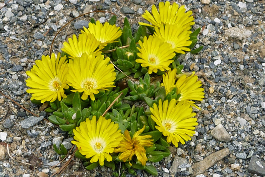 Рассада делоспермы скрученной (Delosperma congestum) имеет очень привлекательный и необычный вид. Листва ланцетная зеленого окраса. Вырастает в высоту до 10 см. В мае и июне цветет большим количеством цветков желтого цвета. Преимущества делоспермы скрученной:
