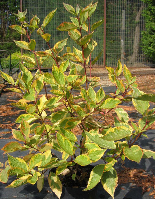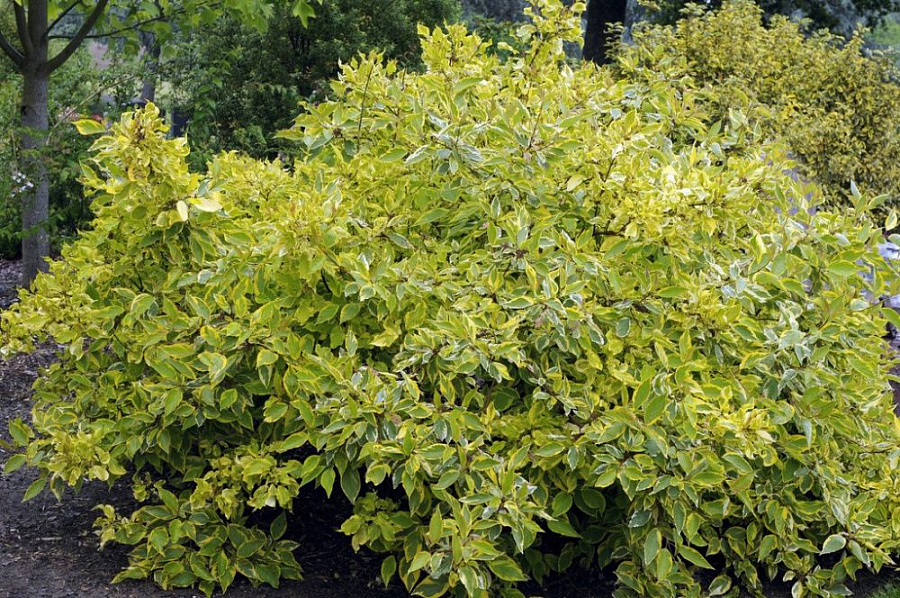 Саженцы дерна белого Гоучаулти (Gouchaultii) достигают двухметровой высоты. За год вытягивается на 30-40 сантиметров. Листья крупномера – ярко-зеленые, с желтовато-розовой каймой. Осенью крона становится пурпурно-красной. Цвести дерен начинает в конце мая, диаметр цветков около полутора сантиметров. Нежно-белые, они буквально обсыпают кустарник. Растение идеально подходит для оформления газонов, формирования живой изгороди. Уход не составит труда даже для неопытных садоводов: