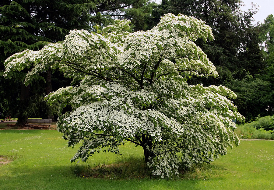 Саженцы дерена Корнус Коуса (Cornus kousa) – дают высокодекоративные кустарники большого роста (5-6 метров) и такого же диаметра кроной. В молодости растет вверх. С возрастом ветви расходятся горизонтально, делая растение похожим на китайскую пагоду. Листья зеленые, осенью приобретают огненную (от желтой – до багряной) окраску. Цветет растение невзрачными зелеными цветками но с красивыми лепестками - прицветниками белого цвета. Плоды дерена Корнус Коуса – съедобные алые ягоды – костянки на плодоножках сладкого вкуса с небольшой терпкостью.