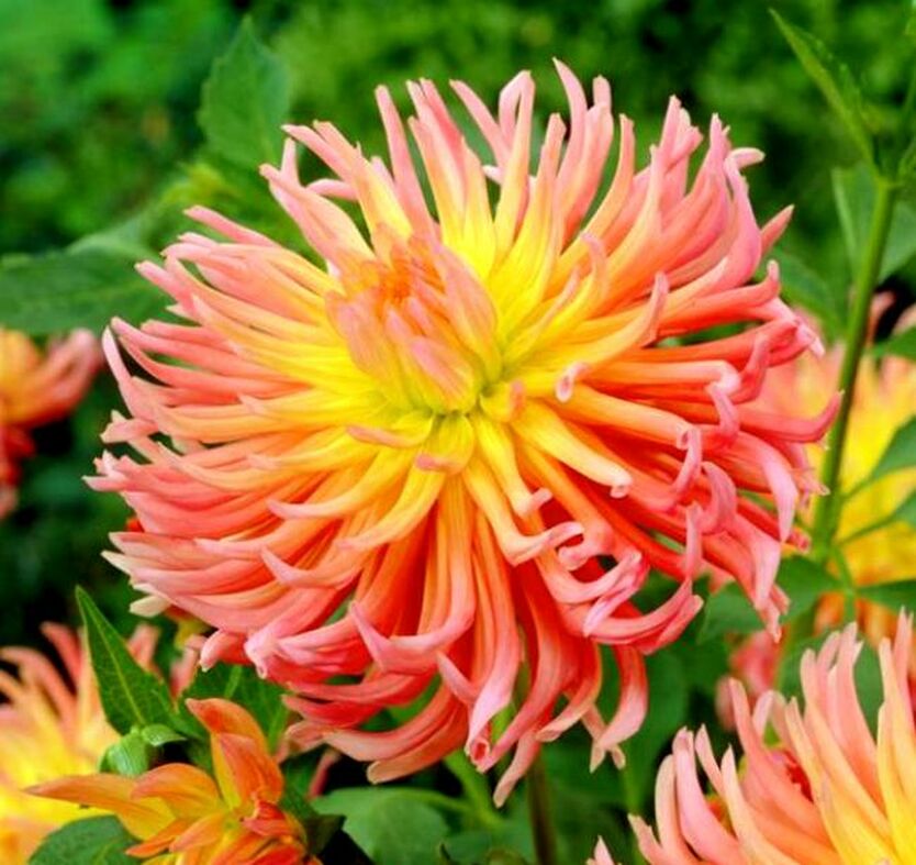 Луковицы георгины Alfred Grille высаживают на солнечные участки с плодородной, рыхлой, умеренно влажной почвой. Это уникальный сорт с невероятно красивыми и большими цветами, которые радуют цветением все лето и осень, вплоть до самых морозов. Серединка бутона окрашена в яркий желтый оттенок. Крайние лепестки светло-розового оттенка. Диаметр цветка достигает до 15-20 см. Лепестки свернуты в трубочку и напоминают иголочки. Высота взрослых кустов достигает до 100 см. Используют георгины Alfred Grille в одиночных и смешанных посадках.