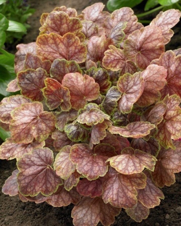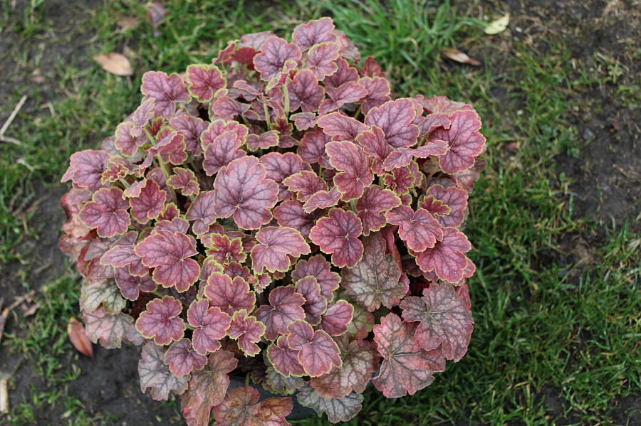 Рассада гейхеры Мастер Пеинтер Гоген (Master Painter Gauguin) порадует удивительным сочетанием красивых двуцветных листьев и нежных розовых цветов. Пурпурная листва с зеленой каемкой сохраняет декоративные качества с ранней весны до поздней осени. Этот сорт прекрасно сочетается с примулами, папоротником, баданом и астибальдой.