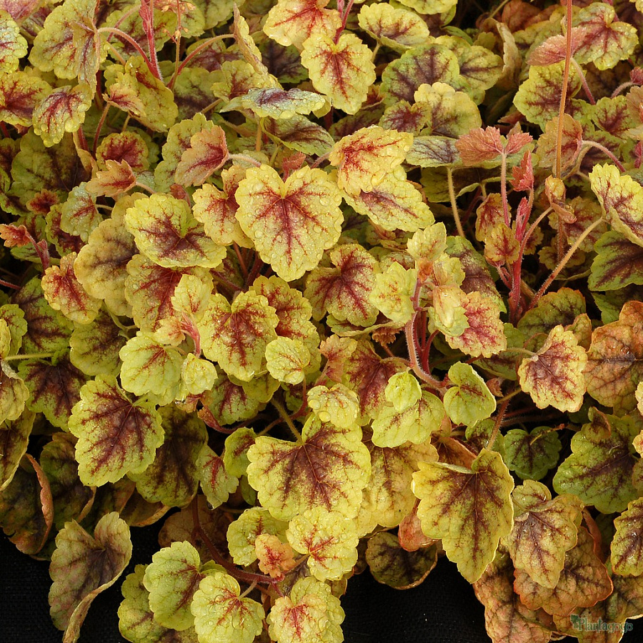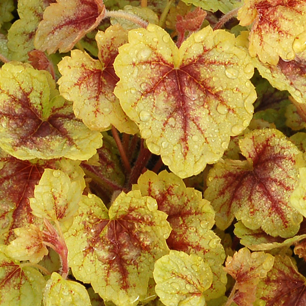 Рассада гейхереллы Голд Каскад (Gold Cascade) станет изюминкой садового ландшафта. Этот сорт привлекает внимание необычной окраской – желто-золотистые листья покрывает узор красно-бордовых прожилок. В июле среди листвы появляются цветоносы с кремово-белыми цветочками. Красивый многолетник гармонично смотрится в смешанных композициях, а также красив в одиночных посадках.