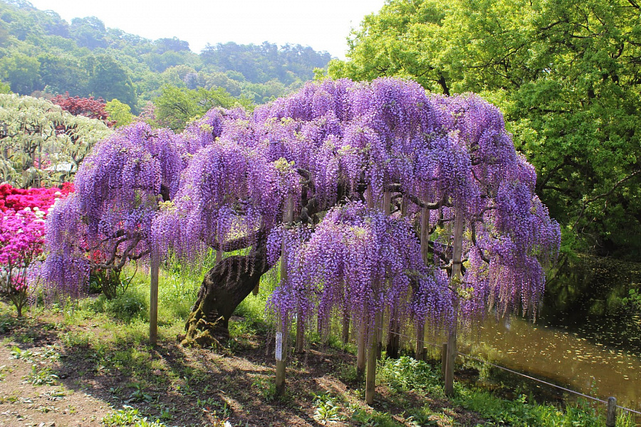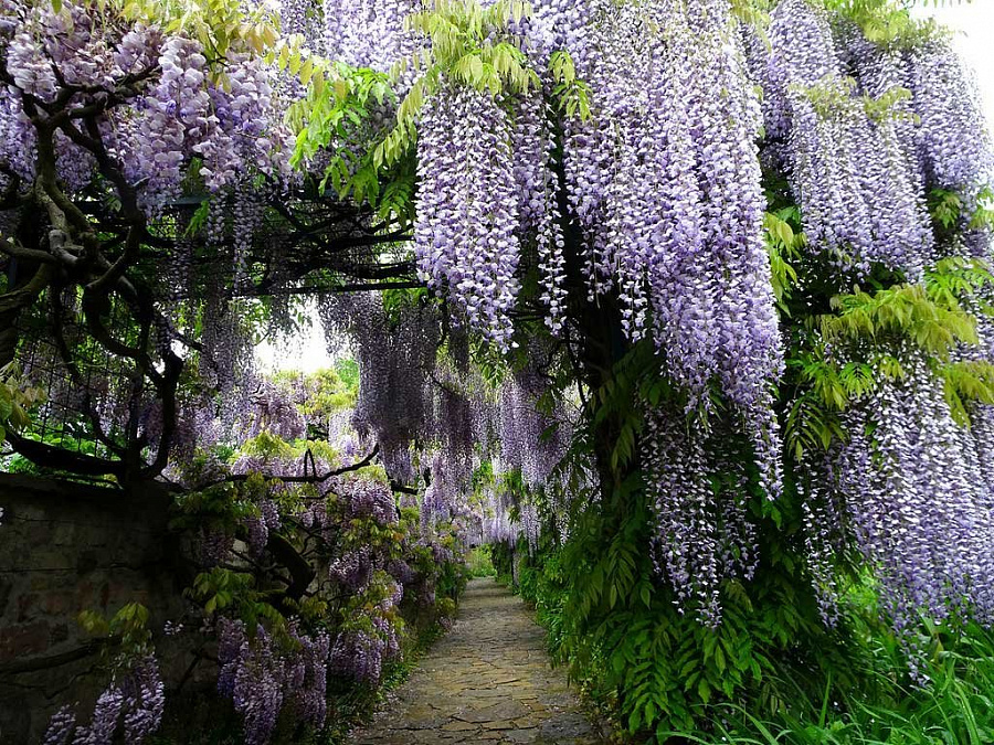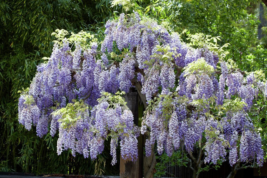 Саженцы глицинии китайской вырастут в прочные лианы, которые во время цветения превращаются в яркие водопады красочных соцветий. Сад с цветущими глициниями – незабываемое райское зрелище. Длина крупномера может достигать больше 20 м. Листва очень изящная, перистая. Свисающие соцветия, длиной до 35 см, усеяны мелкими воздушными цветками. Цветы глицинии китайской распускаются с появлением листвы и держатся до конца лета.