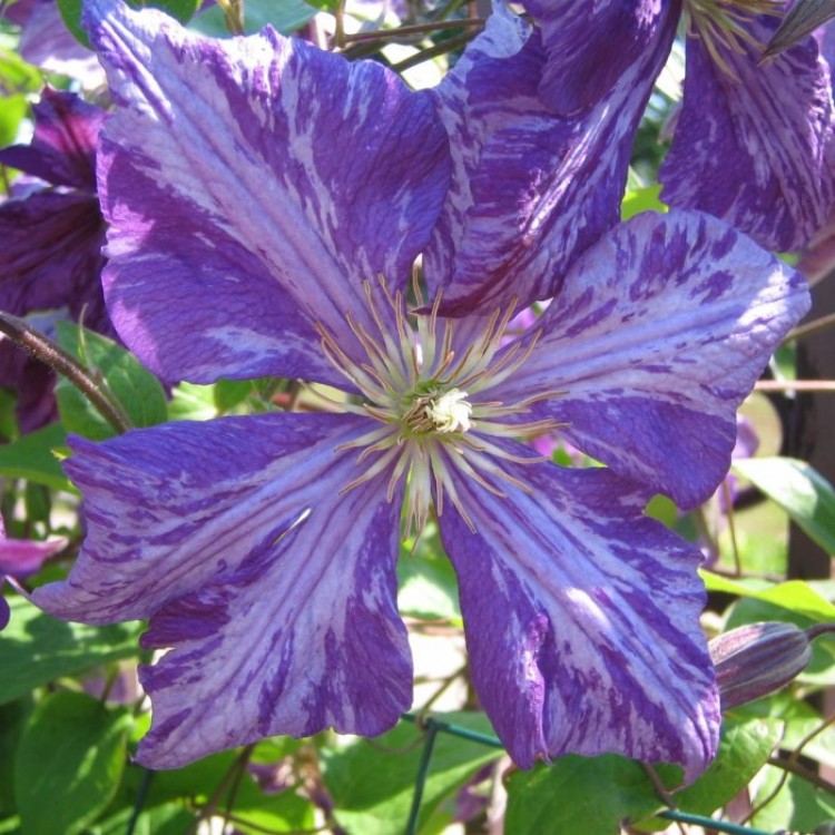 Клематис гибридный Тай Дай (Tie Dye) отличается оригинальным окрасом цветка и быстротой наращивания вегетативной массы.  Цепляясь за рядом расположенные объекты, лиана способна подняться на высоту до 300-350 см. За сезон растение способно обвить арку или беседку. С июня по сентябрь распускаются цветки мраморного окраса, светло-фиолетовые с белыми и лавандовыми штрихами, достигающие в диаметре 10-12 см.  Для клематиса гибридного Тай Дай (Tie Dye) лучшим местом посадки будет рядом с ограждениями, беседками, перголами, на солнце или в полутени, главное чтобы саженцы были защищены от ветра и сквозняков.