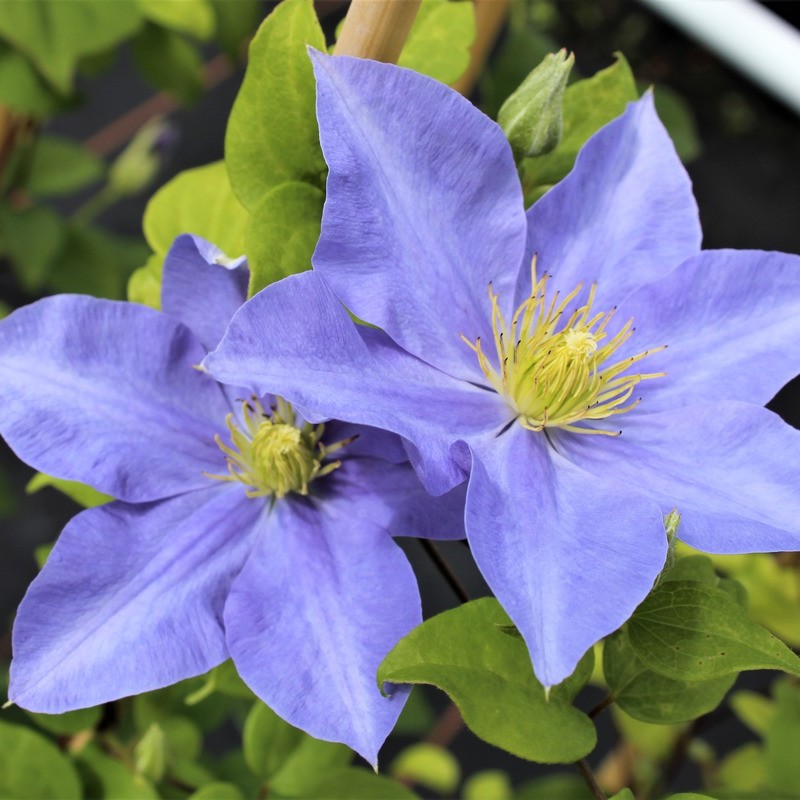 Клематис крупноцветковый Юста - это волшебное растение, способное преобразить ваш сад в настоящий райский уголок. Его крупные цветки светло-голубовато-розового оттенка будут радовать глаз в течение нескольких месяцев весной и летом. Листья клематиса зеленые весной и летом, а осенью приобретают желтый оттенок, создавая яркую палитру красок.