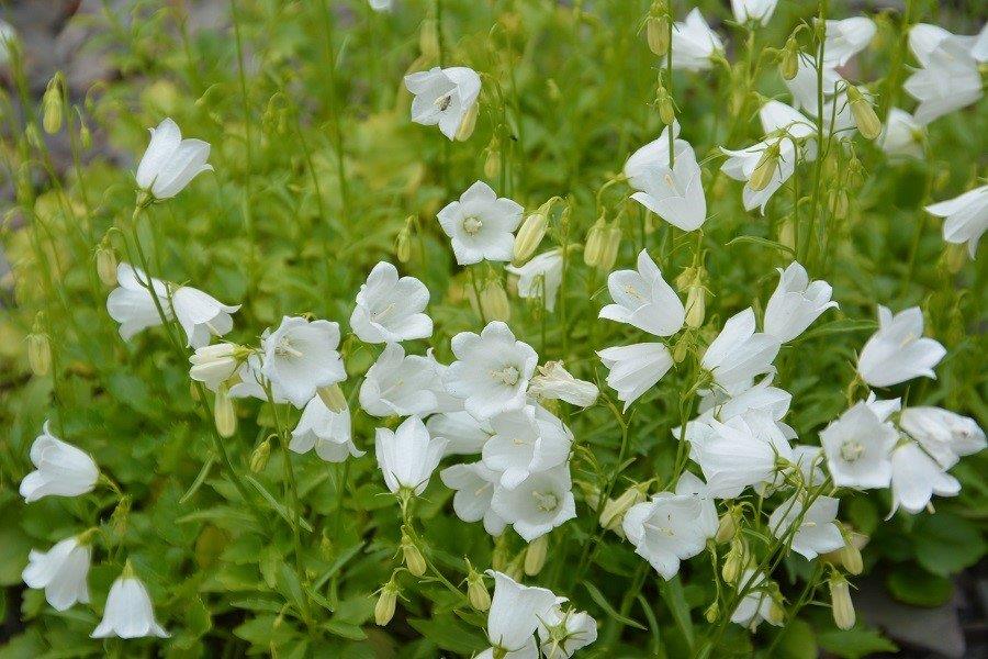 Семена и рассада колокольчика ложечницелистного Бавария Вайт (Bavaria White) быстро разрастаются, покрывая землю плотным зеленым ковром. В начале лета среди зеленой листвы распускаются нежные маленькие цветочки белой окраски. Из-за их обильного количества почвопокровник кажется белым полотном. Этот сорт прекрасно подходит для оформления невысоких подпорных стен и каменных горок.