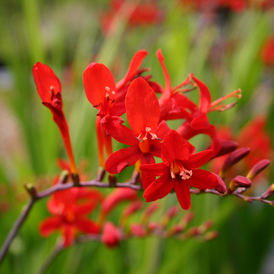 Рассада крокосмии «Люцифер» (Lucifer) высаживается на солнечные участки. Почва подойдет любая, но в совсем бедной растение не будет обильно расти и цвести. Сорт морозоустойчив, но при возможных сильных заморозках растение рекомендуется укрывать на зиму. Из семян крокосмии «Люцифер» прорастают стебли, которые могут достигать в высоту до полутора метров. Цветоносы прямые. Цветы собираются на верхушке в густые соцветия, которые окрашены в яркий красно-томатный оттенок. Рассаду крокосмии «Люцифер» используют для создания цветников и других ландшафтных групп. Также растение долго держится в букетах – до двух недель.