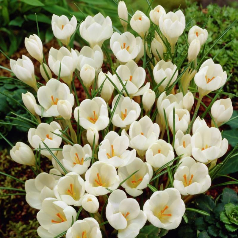 Луковицы крокуса Miss Vain идеально подходят для выращивания в открытом грунте и в контейнерах. Растут на солнце и в полутени, на умеренно плодородных и хорошо дренированных почвах. Глубина посадки луковиц крокуса Miss Vain — 5 см. Период цветения — март — апрель. Цветки бокаловидные, нежного кремово-белого цвета. Состоят из шести лепестков. Листья блестящие, узкие, темно-зеленого цвета, с серебристо-белой полосой посередине. Высота многолетника до 10 см. Он прекрасно смотрится в групповых и смешанных посадках с другими невысокими весенними цветочками.