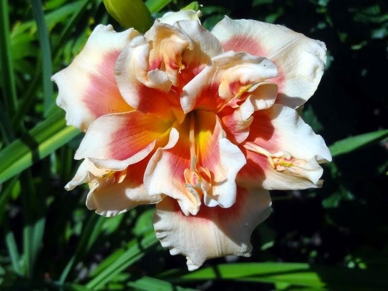 Цветущий лилейник Фоти Секонд Стрит представляет собой завораживающее зрелище. Лепестки имеют нежно-кремовый оттенок с розовой серединкой и зеленым горлышком. Вокруг горла можно наблюдать яркое желтое кольцо. Края внутренних лепестков сильно гофрированные, что придает бутону полноту.