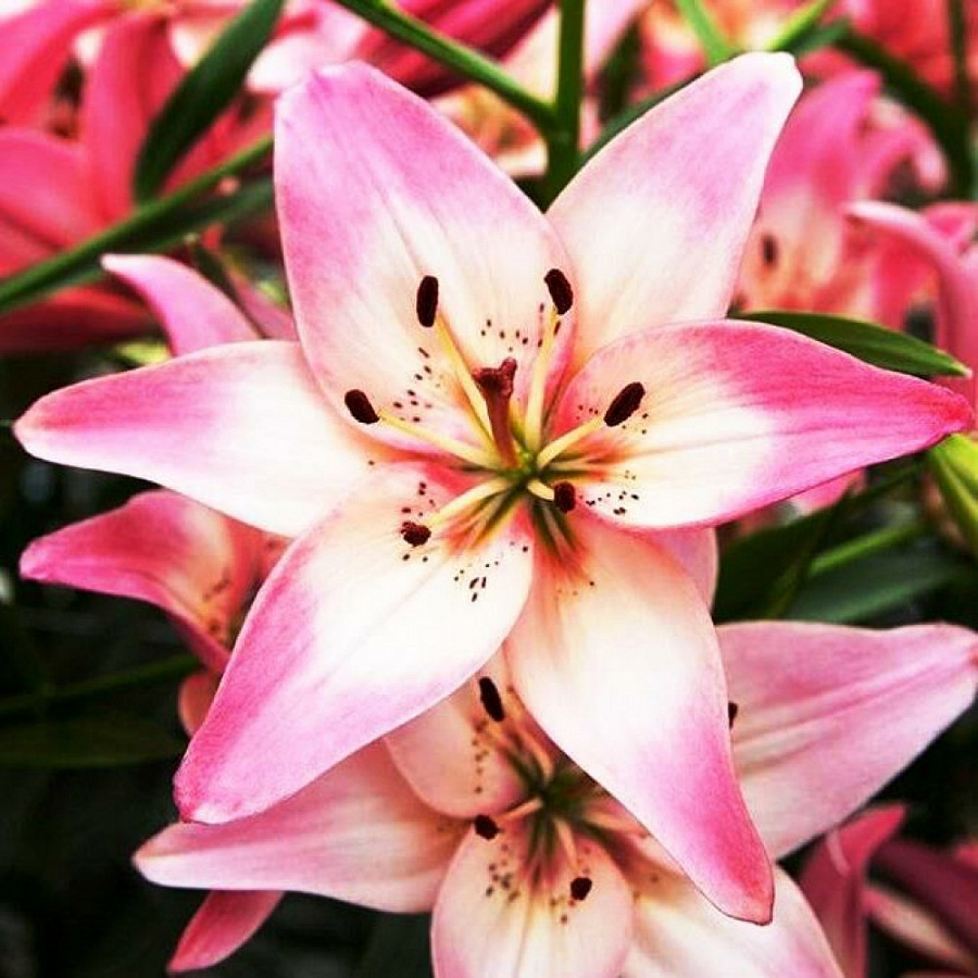Окраска цветка : Центральная часть цветка сливочно-розовая с частым коричневым крапом. Постепенно, ближе к концам лепестков, цвет становится насыщенно-розовым. Тычинки также, как и крап, коричневые