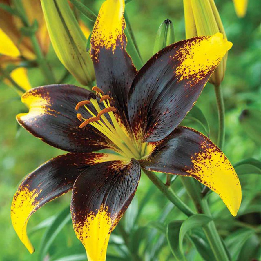 Окраска цветка : цветы золотисто-желтые, с многочисленными темными крапинками, сливающимися в широкую темно-лиловую сердцевину, классической звездчатой формы, широко-раскрытые, направлены вверх и в стороны