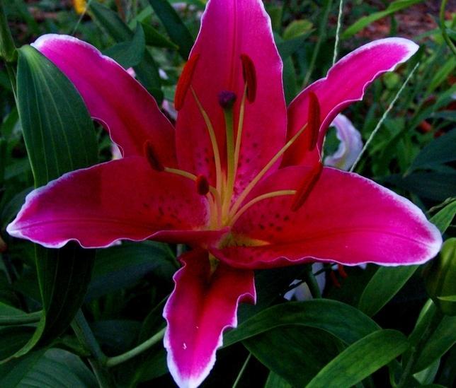 Окраска цветка : насыщенно-розовый с темным крапом, кончики белые