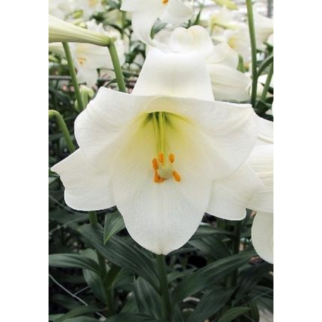 Лилия Лонгифлорум Уорлд Трейд - это великолепное растение с белыми цветками и нежно-зеленым горлом, которое поражает своей изящностью и красотой. Сорт этого растения отличается высотой до 50 см и размером цветка до 15 см, что делает его идеальным выбором для газонов, групповых и одиночных посадок.