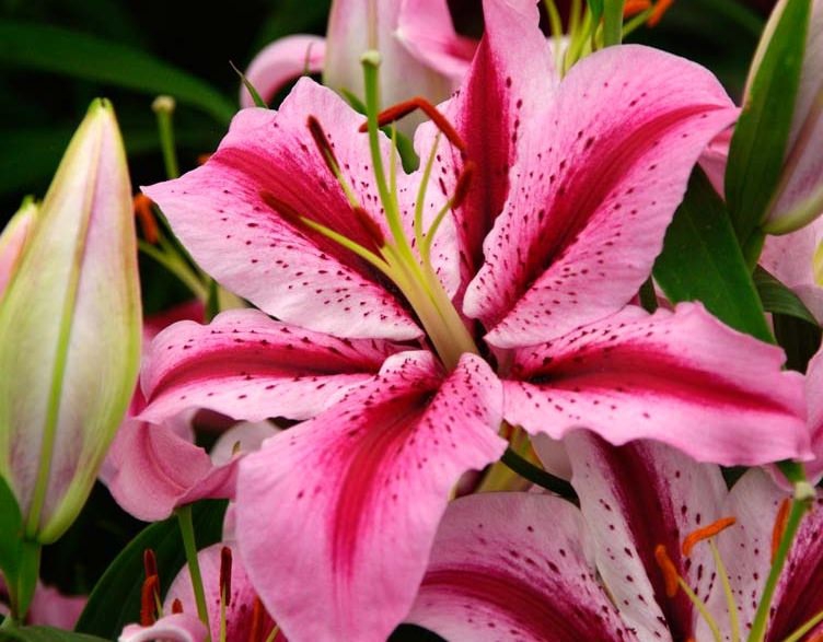 Луковицы лилии восточной Джейберд (Lilium hybrid oriental Jaybird) подойдут любителям ярких кукольных оттенков. Цветы этого сорта крупные (до 22 см в диаметре), появляются в середине и в конце лета, по несколько штук на одном цветоносе. Они окрашены в насыщенный розовый цвет, а в центре каждого лепестка находится темная бордовая кайма. Дополнительно можно рассмотреть редкий красный крап. Лилия Джейберд выглядит нарядно на клумбах и в букетах. Стебли очень прочные, достигают 120 см в высоту. Сорт популярен в летних цветочных композициях отдельно или в комбинации с другими растениями. Особенно он ценится за неприхотливость к условиям содержания и высокую морозостойкость — до –34 градусов под укрытием.