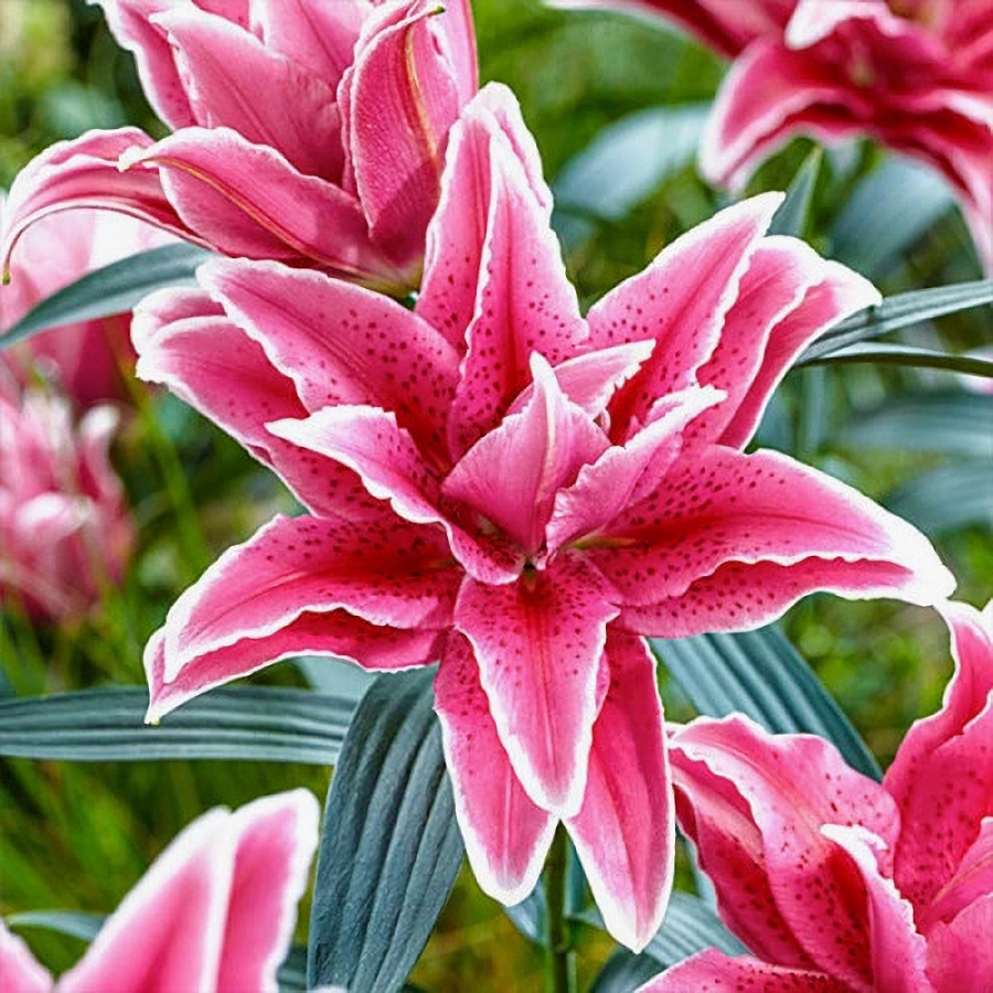 Лилия восточная махровая дабл фэнтази - это настоящее воплощение волшебства и красоты в вашем саду. Ее стебель устойчивый и прочный, достигает высоты до 100-120 см, а цветки, размером 20-25 см, поражают своей насыщенно-розовой окраской с белой каймой и малиновым крапом. Листья лилии зеленые, создавая яркий контраст с цветами.