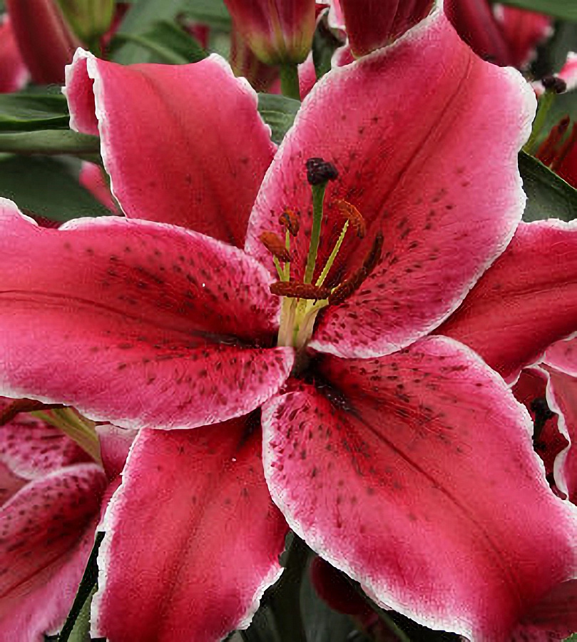 Луковицы лилии восточной Зорро (Lilium hybrid oriental Zorro) используются для получения высококачественной срезки и украшения сада привлекательными и очень ароматными цветами. Расти многолетник предпочитает на солнечных участках. К почве растение не требовательно. Но лучшим выбором будут дренированные, питательные, песчано-глинистые или известковые грунты. Зацветают лилии восточные Зорро в июле – августе. Бутоны очень крупные, диаметром до 22-25 см. Лепестки широкие, окрашены в малиново-красный оттенок и украшены белоснежной окантовкой. Края волнистые. На одном стебле (высота до 120 см) одновременно формируется 12-14 бутонов.
