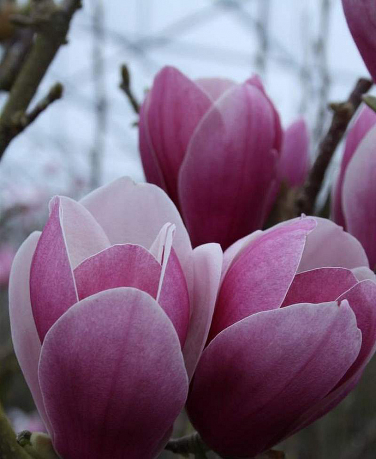 Саженцы Магнолии cуланжа Сатисфэкшн (Satisfaction) – красивый кустарник округлённой формы. Отличается медленным ростом. Листочки тёмно-зелёного цвета осыпаются осенью. Примечательно, что цветение может начаться как во время роста листьев, так и до этого периода. Обычно багрово-розовые соцветия в форме чашечки появляются в конце апреля. В это время магнолия очень ароматная.