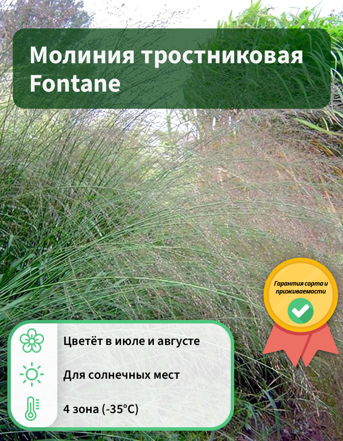 Рассада молинии тростниковой Фонтан (Fontane) обладает невзрачными соцветиями коричневого цвета, которые придают естественность искусственным водоёмам, создавая эффект лёгкой заболоченности. Фонтаном его принято называть из-за цветоносов, которые растут не прямо вверх, а в разные стороны. Иногда они достигают почти полутора метров в высоту, поэтому служат отличным фоном для сада, разбавляя яркие краски других цветов. Достоинством рассады считается неприхотливость и зимостойкость.