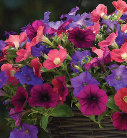 Листья петунии ампельной F1 шок роял микс имеют форму, напоминающую сердце, что добавляет растению нежности и изящества. Цветки этого сорта окрашены в уникальную комбинацию синего и кораллово-красного цветов, создавая неповторимый вид.
