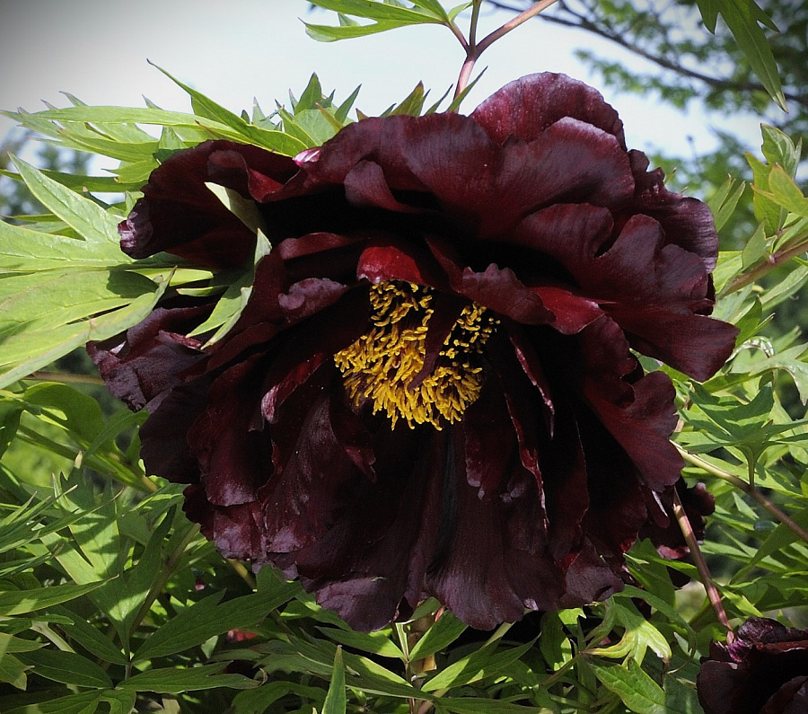 Саженцы пиона древовидного Black Panther (Блэк Пантер) Привлекательный древовидный пион для сада с яркими цветами насыщенного темно-красное дерево-малиновый с шоколадно-коричневыми, почти черными отблесками, очень яркие шелковистые мягкие лепестки, с выступающими желтыми тычинками в центре. Отлично подходит в качестве акцента в саду. Цветы отлично подходят для срезки с легкий, пряно-сладкий ароматом. Имеет зеленую лиственную листву. Это относительно неприхотливый в уходе кустарник, и он не должен требовать большой обрезки. В отличие от травянистого пиона стебли такого растения в осеннее время не увядают, а с каждым годом разрастаются все больше, и со временем кустик приобретает полушаровидную форму. Характерные особенности растения: