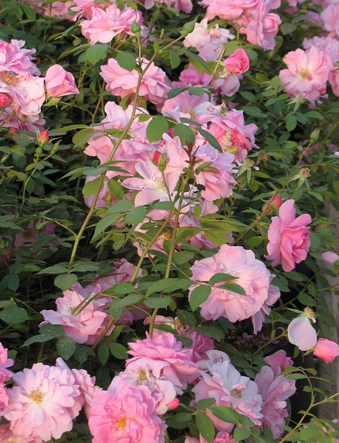 Саженцы розы плетистой John Davis — это сорт, который устойчив к заболеваниям и считается одним из самых зимостойких. Цветет растение довольно крупными кистями. Во время массового цветения насчитывается до 15-17 цветков одновременно. Соцветия нежно-розового окраса, чашевидные, махровые. Цветочки состоят из 30-40 лепестков, диаметром 7-9 см. Они не имеют резкого запаха. Лишь немного присутствует легкий фруктово-пряный аромат. Взрослый куст достаточно густой, крупный и гибкий, полностью усыпан глянцевой зеленой листвой. В высоту достигает до 250 см.