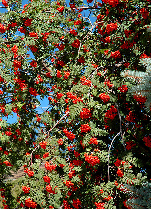 Рябина станет настоящей гордостью сада, ведь необычный вид будет притягивать восхищённые взгляды. Все ветки покрыты резными листочками и элегантно ниспадают к низу. Большие цветы кремового цвета образуют соцветия, получаются крупные шапочки. А осенью созревают яркие красно-оранжевые ягоды. Ветви у дерева легко гнуться и их можно подстричь на свой вкус.