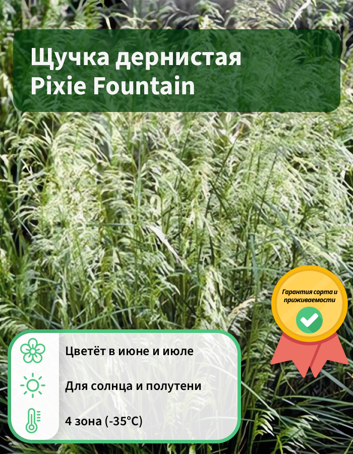 Рассада щучки дернистой Pixie Fountaine (Deschamsia cespitosa) широко используется в садах разных стилей и прекрасно смотрится в массовых посадках. Растение сочетается почти со всеми многолетниками, особенно с розой, амсонией, кровохлебкой, горцем, шалфеем, эхинацеей. Лучше всего щучка дернистая Pixie Fountaine растет в умеренной тени или на солнце. Почва подходит влажная. Кустик в начале лета имеет ярко-зеленую листву высотой от 40 до 60 см. В середине июня декоративная трава начинает зацветать метелками серебристо-зеленого цвета, которые со временем меняют свой окрас на золотисто-коричневый.