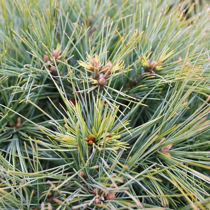 Саженцы сосны Веймутова Минима (Minima) – карликовые шаровидные кустарники с голубовато-зеленой кроной, усыпанной золотыми свечами растущих побегов. Средняя высота взрослого крупномера не больше 1м, диаметр до 1,7 м. Ветвистые побеги начинают рост от земли, что придает сосне Веймутова Минима пушистую округлость. Хвоя средней длины, по мере роста, меняет оттенок от желто-лимонного до голубого, поэтому кустарник смотрится живо и контрастно.