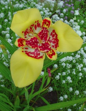 Луковицы Тигридии павлинии Еллоу (Yellow, Tigridia pavonia) отлично прорастут и подарят прекрасное экзотическое растение, которое будет украшением сада, террасы на длительный период лета и осени с июля по ноябрь. Тигридия великолепна, она вырастает до 50-60 сантиметров в высоту, имеет ланцетовидные листья, крепкие цветоносы, на которых формируются от одного до трех крупных цветков. Форма и большие размеры цветов восхищают. Диаметр их составляет 10-15 сантиметров, лепестки большие ярко – желтые с тигровой окраской середины в виде красного крапа. Во время обильного цветения этого растения сад будет лучшим местом препровождения. Многолетник любит солнце и не переносит ветра и похолодания.