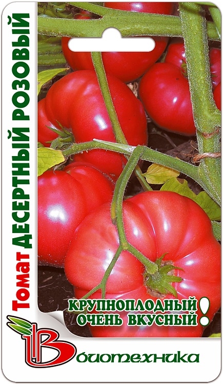 Семена томата "Десертный розовый" (Desertnyj rozovyj) высевают на рассаду в марте-апреле. В мае – начале июня производят пересадку в открытый грунт. Растения высокорослые, в высоту достигают 1,5-2 метра. Сорт среднеспелый, период от всходов до созревания составляет 110-115 дней. На одном растении формируется 4-5 кисти, каждая по 3-4 плода. Помидорки плоско-округлые, очень крупные, средняя масса 250-300 грамм. Кожица и мякоть ярко-розовая. Мясистые плоды обладают великолепным десертным вкусом. Использовать урожай рекомендуется для потребления в свежем виде.