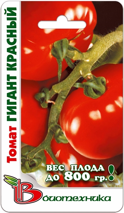 Семена томата "Гигант красный" (Gigant krasnyj) принадлежат к любительскому, крупноплодному сорту. Растение сильнорослое, может достигать в высоту 1,5-1,8 м. Сорт среднеспелый, созревает на 105-110 день после появления первых всходов. Плоды крупные, масса варьируется от 250 до 500 грамм. Они плоскоокруглой формы, красного цвета, с нежной кожицей. Мякоть плода мясистая, сочная, сладкая на вкус. Основная ценность сорта – высокая урожайность, с 1 кв. м собирают 10-12 кг. Также культура устойчива к основным заболеваниям. Используют плоды в свежем виде и для переработки.