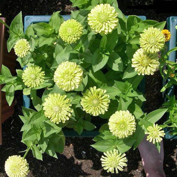 Семена цинии изящной сорта Энви порадуют всех, кто любит пышные цветы нежных расцветок. Это растение представляет собой крупный куст высотой около 60 см, на котором распускаются полушаровидные соцветия редкого зеленовато-лимонного оттенка.