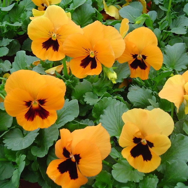 Виола крупноцветковая инспайер плюс оранж блотч - это удивительное растение с яркими оранжевыми цветками и черным центром, которые будут радовать вас своим великолепием в августе, сентябре и октябре. Этот сорт виолы отличается высотой до 20 см и диаметром цветка до 8 см, что делает его прекрасным украшением для вашего сада или огорода. Листья виолы зеленые, что создает красивый контраст с яркими цветами.