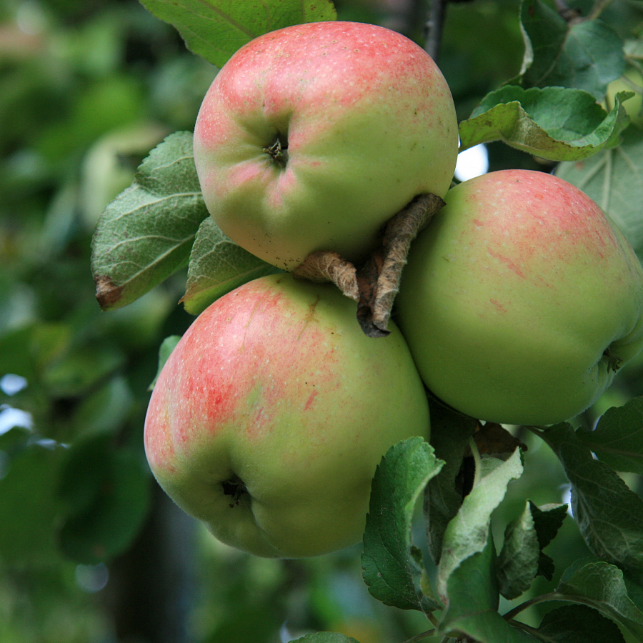 Плоды достаточно крупные и округлые, немного конусообразные к верхушке, зеленоватые, с кремовым оттенком и красным полосатым размытым румянцем. Крупномеры чрезвычайно зимостойкие и высокоурожайные.